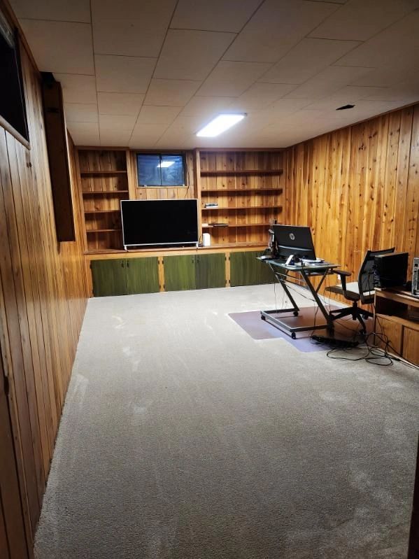 Large paneled room, lots of storage shelves and cabinets